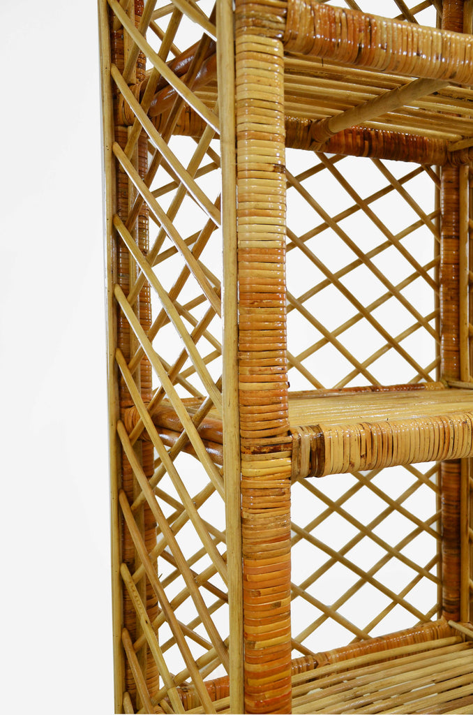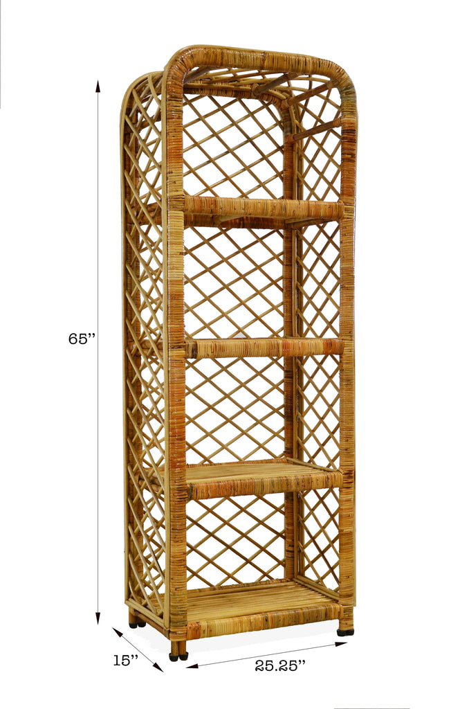 • The Melody Natural Rattan Wiker Shelf is a solid hardwood frame that is hand-wrapped in rattan to achieve just the right texture and variation in tone. Brass end caps on the feet add a beautiful finishing touch. It is the perfect frame for displaying pottery, books, photos, and other decorative accents. This rattan shelf features open storage to showcase and organize home accessories.